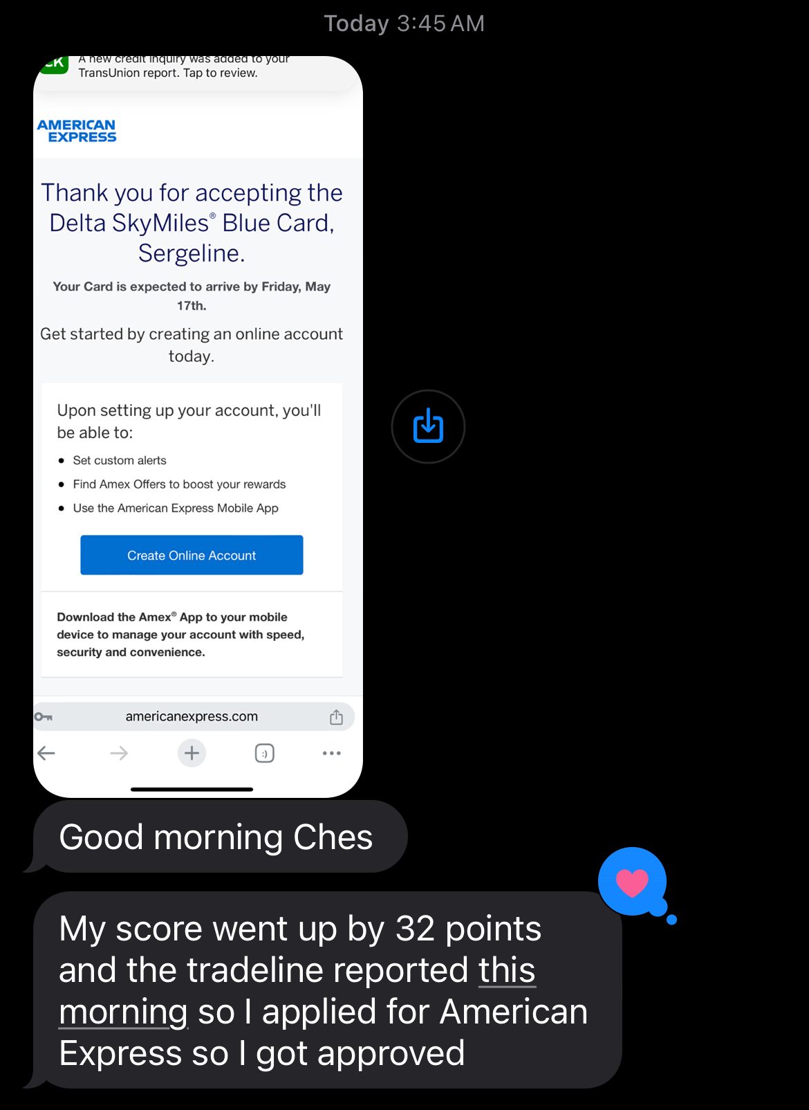 When we first started working with Dexter he was 19 at the time, we guided him step by step on how to boost his personal credit profile to maximize his approval odds. Added accounts to help with his credit mix and finally successfully applied for business credit cards with our Relationship Bankers.